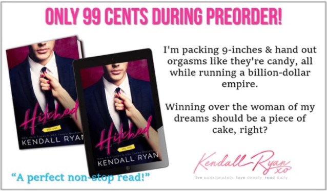 On the heels of her smash hit and New York Times bestselling SCREWED series, Kendall Ryan brings you HITCHED, a romantic comedy that delivers heart and heat. A NYC playboy turned business mogul has ninety days to win over the woman he’s always desired in order to save his father’s company. One tiny problem: She hates his guts.